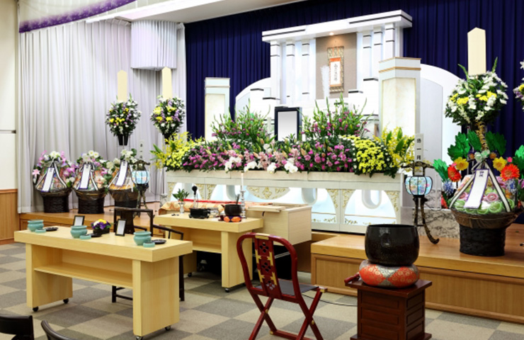 半紙を敷いた上に、生花・菓子・飲み物などのお供え物を置きます。生花は茎の長さを揃え、新しい水を入れた花立てに入れましょう。