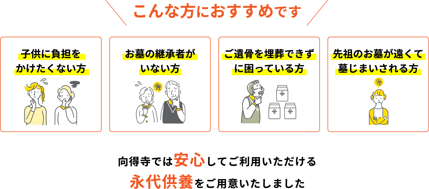 A 普通のお墓は家の継承者によって代々受け継がれていくことを前提としており、継承者がいなくなった時点で、無縁墓として処理されているのが現状です。永代供養墓の場合は、その心配がいりません。