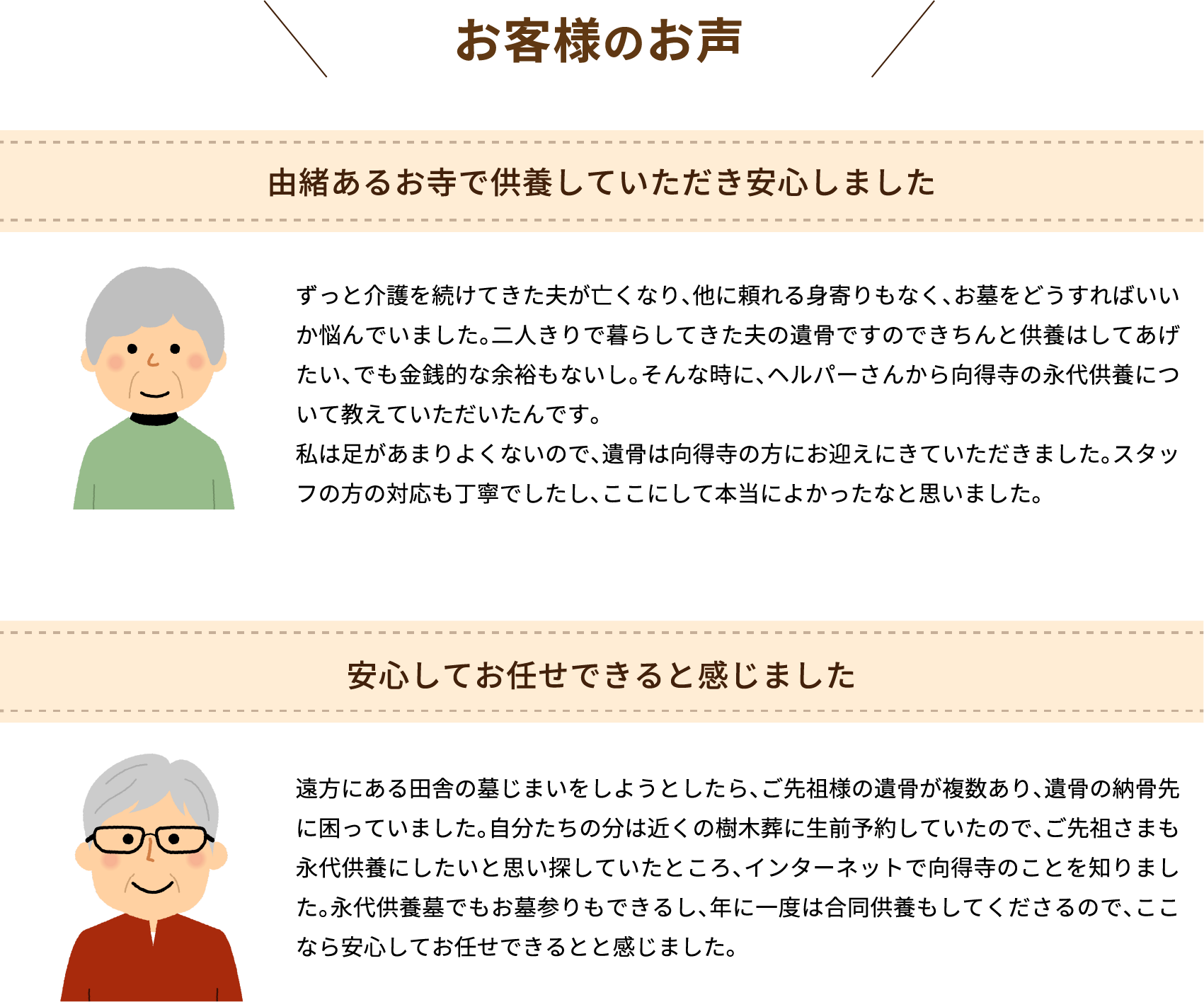A 跡継ぎがいない方、身寄りがいない方、子どもがいない方、生涯独身の方・・・などですが、友人同士や親族同士の方々も多数おみえです。ご遺骨をすべて納骨し、お墓としてご利用される方やお墓はあるのですが、ご供養のみを依頼される方も多くおみえです。