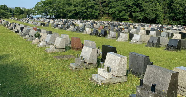 一般的には「樹木葬」と呼ばれる墓地で、樹林墓地(樹林型合葬埋蔵施設)と樹木墓地(樹木型合葬埋蔵施設)の2種類があり、いずれも、シンボルツリーの下、芝生に覆われた墓域にご遺骨を布製の納骨袋に移して埋蔵します。樹林墓地は樹林の下に設置されたカロートに、他の方の遺骨と一緒に埋葬するのに対して、樹木墓地は樹木の周辺に、遺骨を個別に1体ずつ埋蔵します。他にも、樹林墓地は生前でも申し込める、使用料が安い粉状遺骨(パウダー状にした遺骨)で申込みができるなどの違いがあります。粉状遺骨で申込みを行う場合、使用者自ら遺骨を粉状にする業者を探す必要があります。遺骨を粉状にするには松戸家へお申しつけください。
