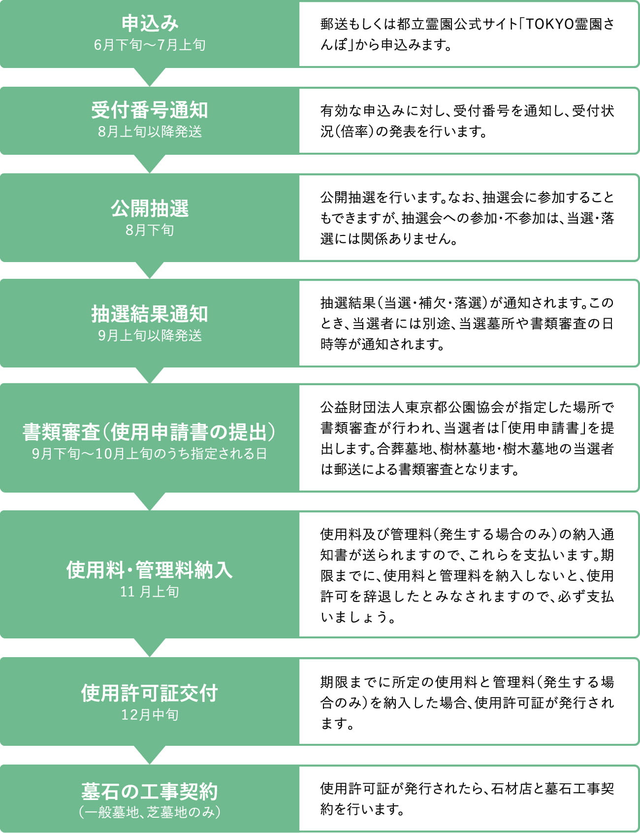 民間霊園では、多くのところが申込みがあった順の受付となりますが、都立霊園は申込み多数の場合は抽選となり、例年ほぼ全ての区画が抽選となります。倍率は数倍からものによっては、30倍を越えることもあります。